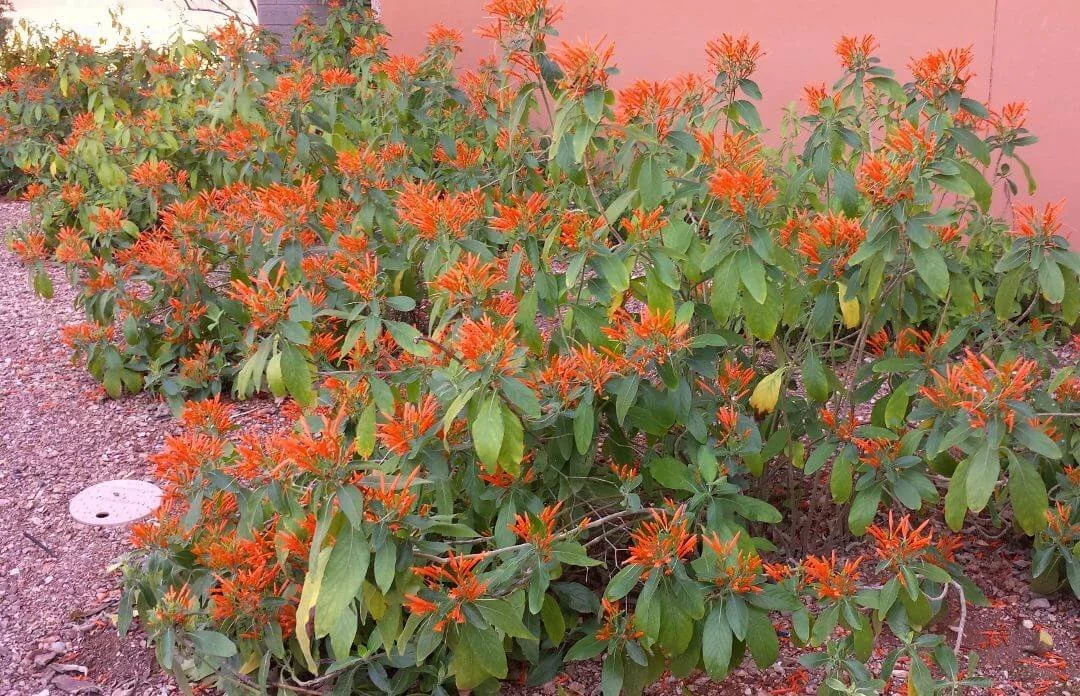 8’x8’; Evergreen; Full sun-part shade; Blooms Sept-Feb; Attracts hummingbirds; Very versatile plant; Prune back to create denser shrub; Takes shearing well; Can be trained as a vine or left to its natural form.