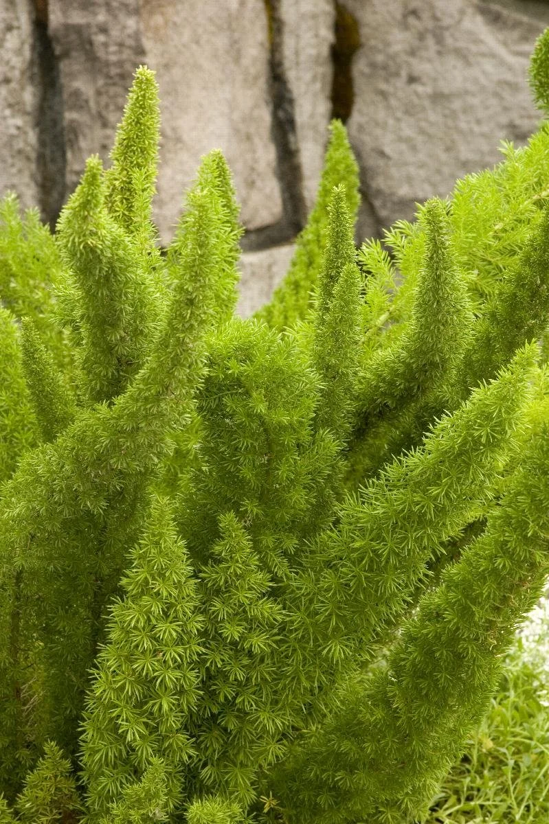 This low-growing evergreen has feathery, upright, bright green, needle-like stems and trailing branches. It is not a true fern but has fern-like foliage and a dense growth habit, growing two to three feet tall and three to four feet wide. It has a tall, fluffy frond-like appearance.