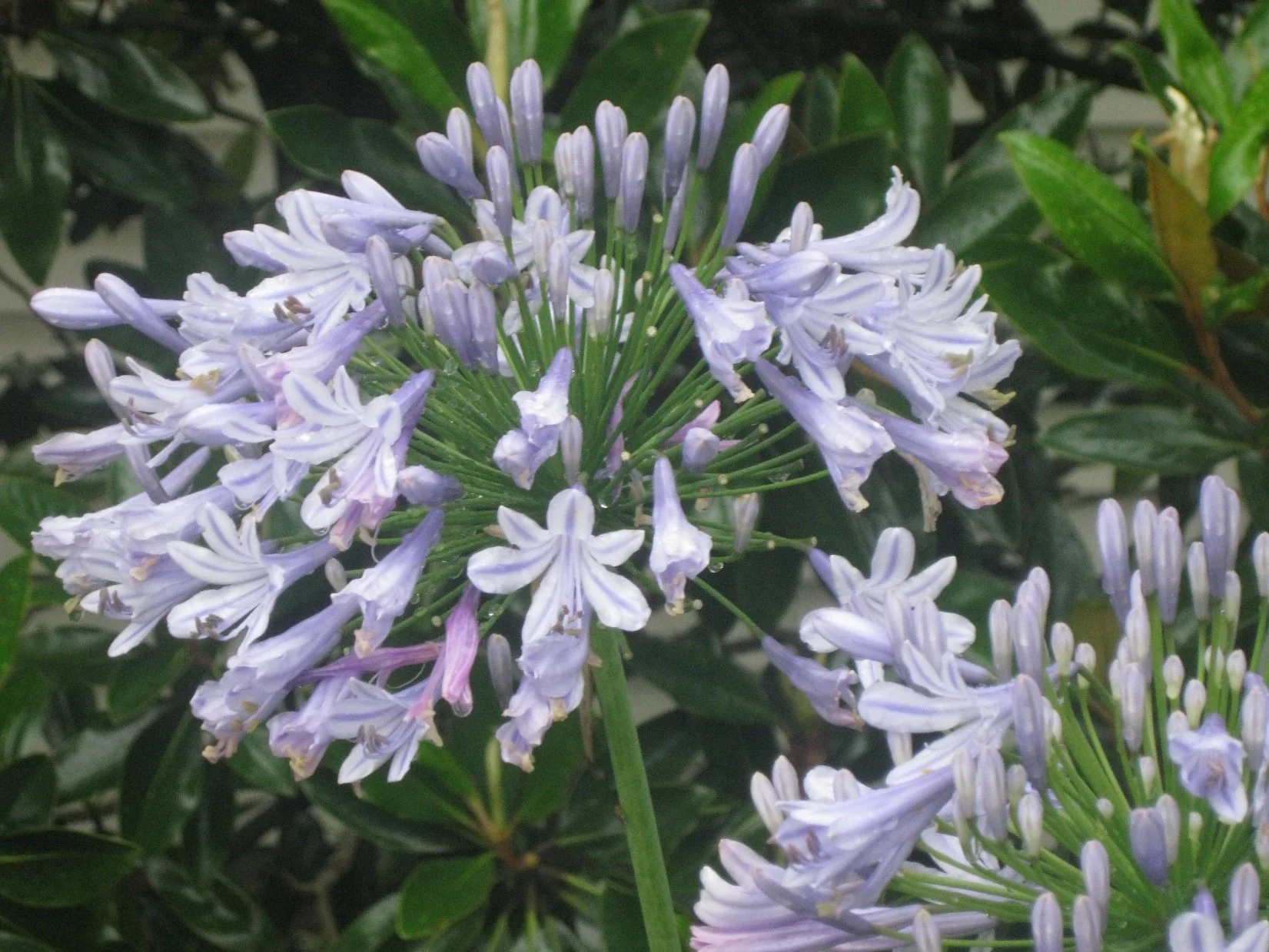 The blooms are beautiful and range from white to violet blue to dark blue. They produce large, round clusters of funnel shaped flowers at the end of a tall (2-4 foot), thick stem measuring 6-8 inches across. They are surrounded by nice looking clumps of long, strap-like leaves that are slightly curved in or out of the blooming season. They bloom from late spring to early autumn.